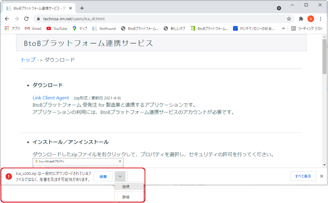 使用しているブラウザがChromeの場合、ダウンロード警告が表示される場合があります。