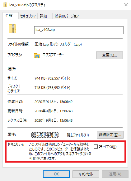 ダウンロードしたzipファイルを右クリックして、プロパティを選択し、セキュリティの許可を行ってください。
