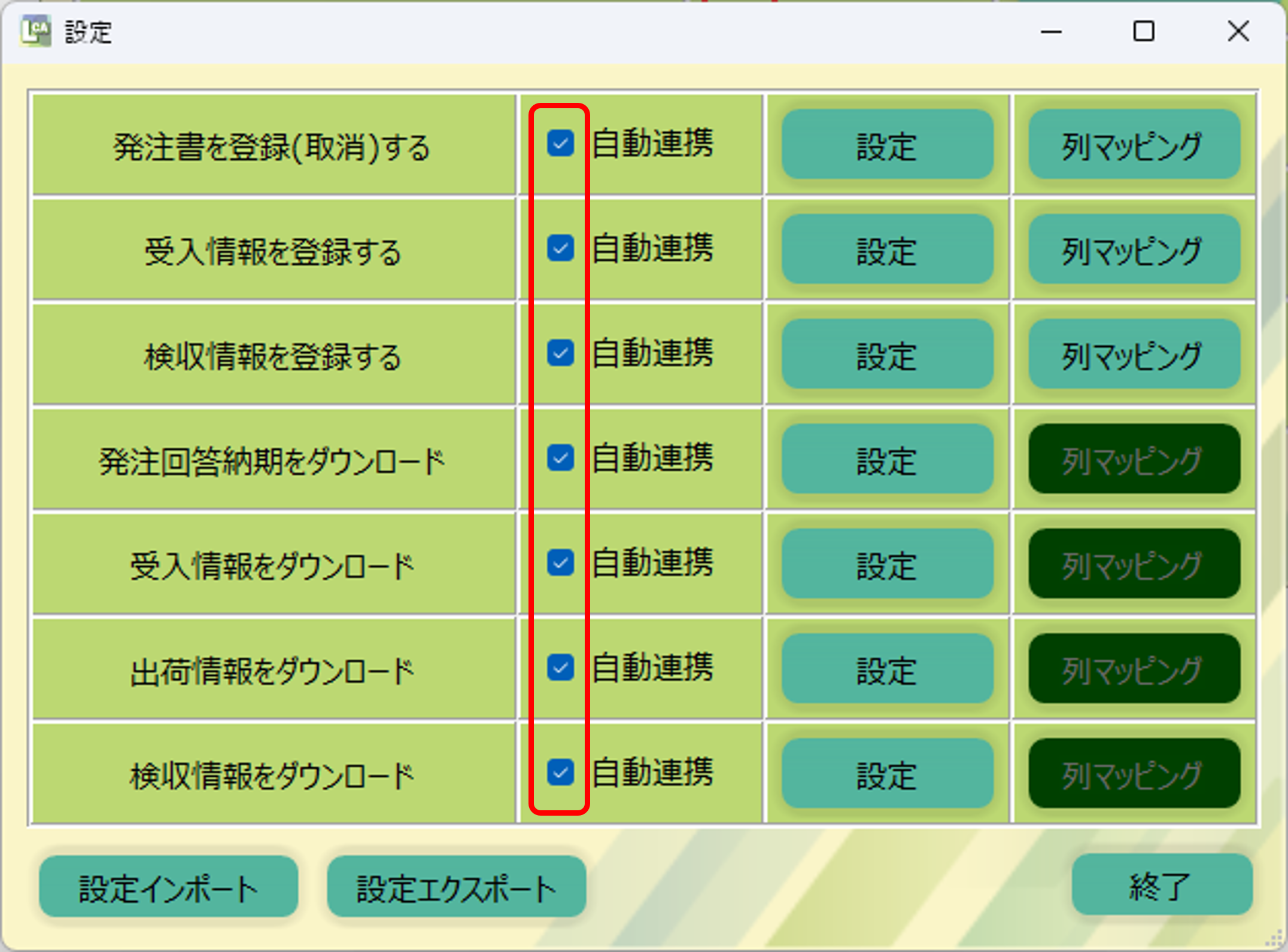| 発注回答納期をダウンロード | BtoBプラットフォーム上で外部サービス取込待ちの発注情報を取得します。 ダウンロードすると、BtoBプラットフォーム上の外部取込サービスは「取込待ち」から「取込済」になります。 |