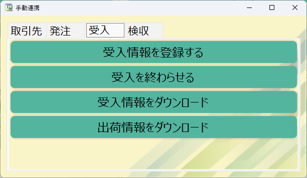 | 受入情報をダウンロード | BtoBプラットフォーム上で登録された受入情報を取得します。 ダウンロードすると、BtoBプラットフォーム上で登録された受入データは変更なしの状態となります。 |
