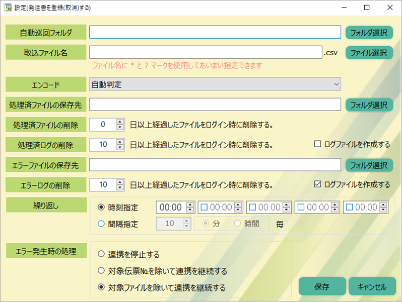 | エラーファイルの保存先 | エラーとなったファイルを退避させる場所を指定します。 |